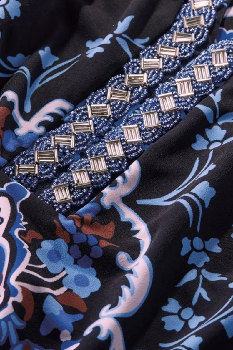 An easy silhouette elevated with an intricate allover print and stunning beadwork. The embellished split neckline really makes this style a standout. The 3/4 blouson sleeves lend volume and versatility. The pockets? Easy convenience.
