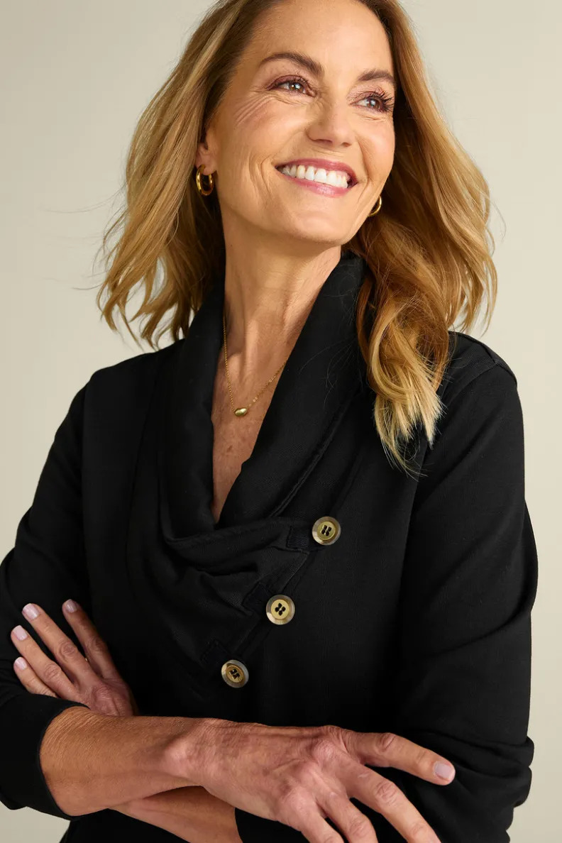 Luscious French terry, with its soft piles of yarn on the inside, make this piece the coziest. The generous overlapping collar is accented with buttons and pleats for extra style points and a lovely drape. Long sleeves. Front pockets.