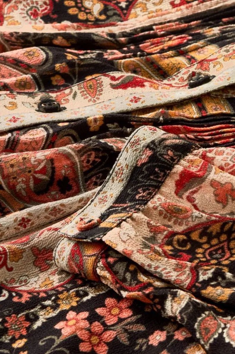 Elaboration is elemental in this baroque Mandarin collar button-down tunic, with pintucks at front bodice, and shirring …