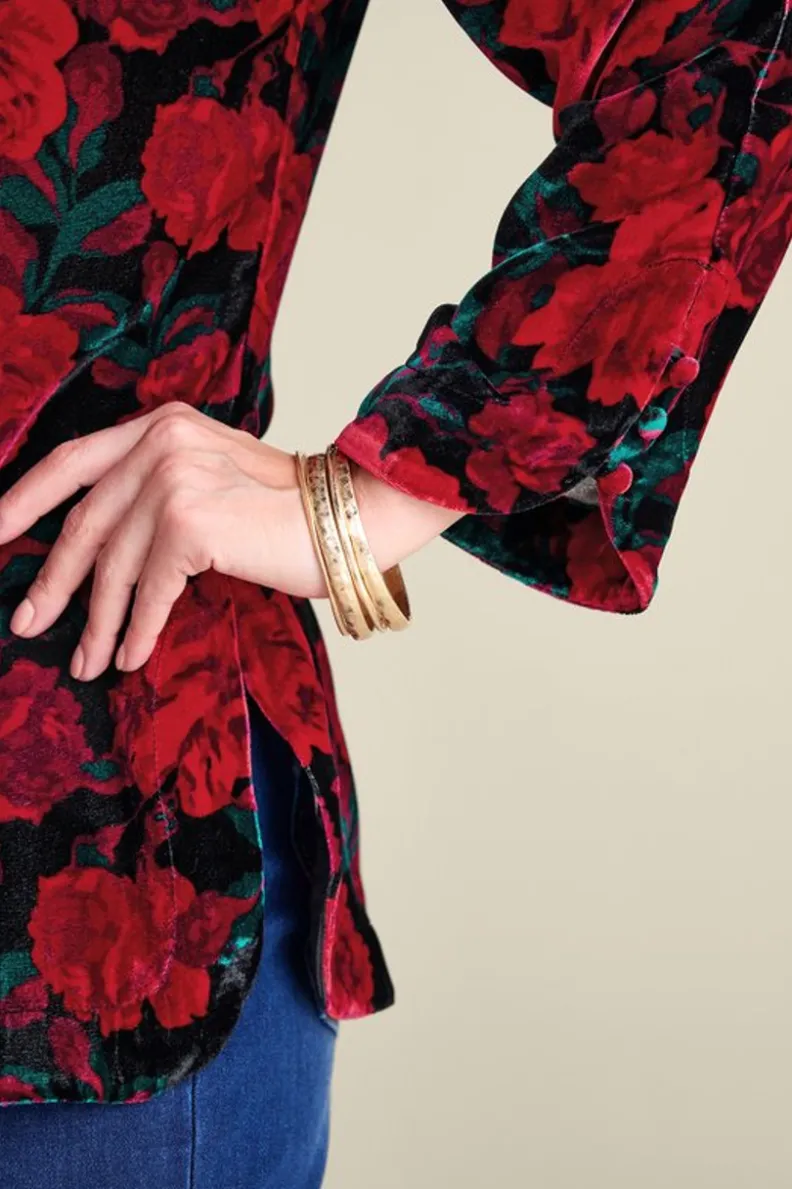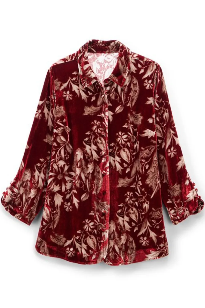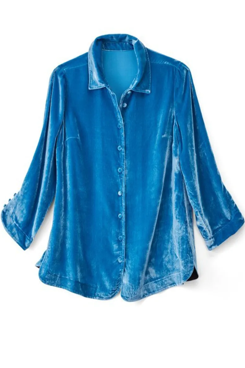 Lavish the hours in our lush and silky velvet blouson, with curved openings at full front placket and button-detailed 3/4 sleeve openings, bust darts, and side-slit hem.