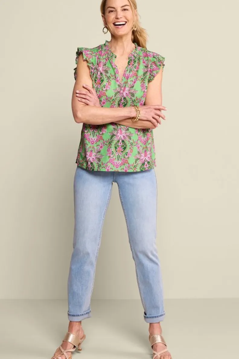 This top has so much to offer. First, the lightweight and airy linen blend it drapes beautifully and moves effortlessly with you. Next, the feminine touches like the ruffled collar and ruffle cap sleeves. And, by the way, the split neckline makes just enough space for your favorite necklace. Finally, the perfect summer colors and stunning tropical print.