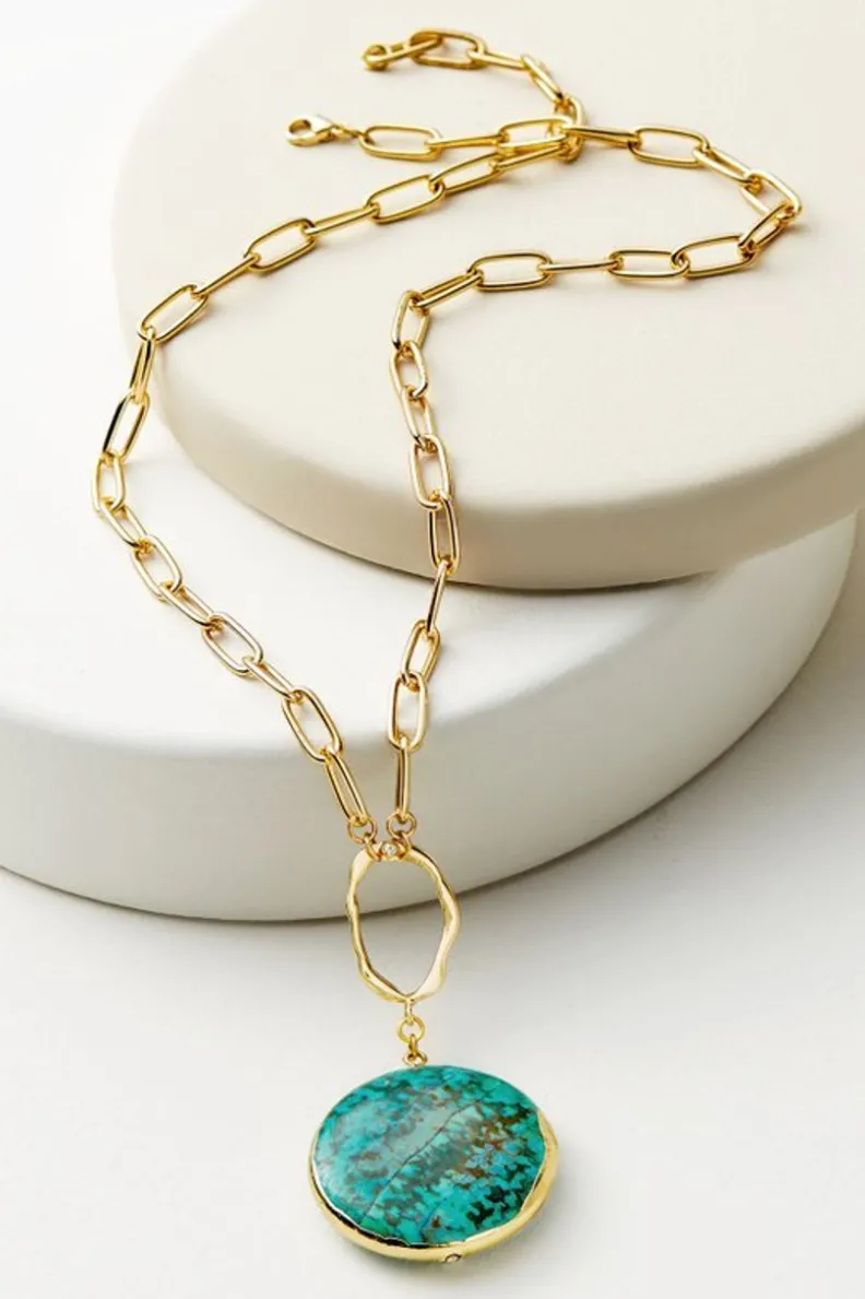 A natural beauty, turquoise is said to have many benefits, among them being promoting peace and tranquility, making this pendant both striking and serene. Claw closure.