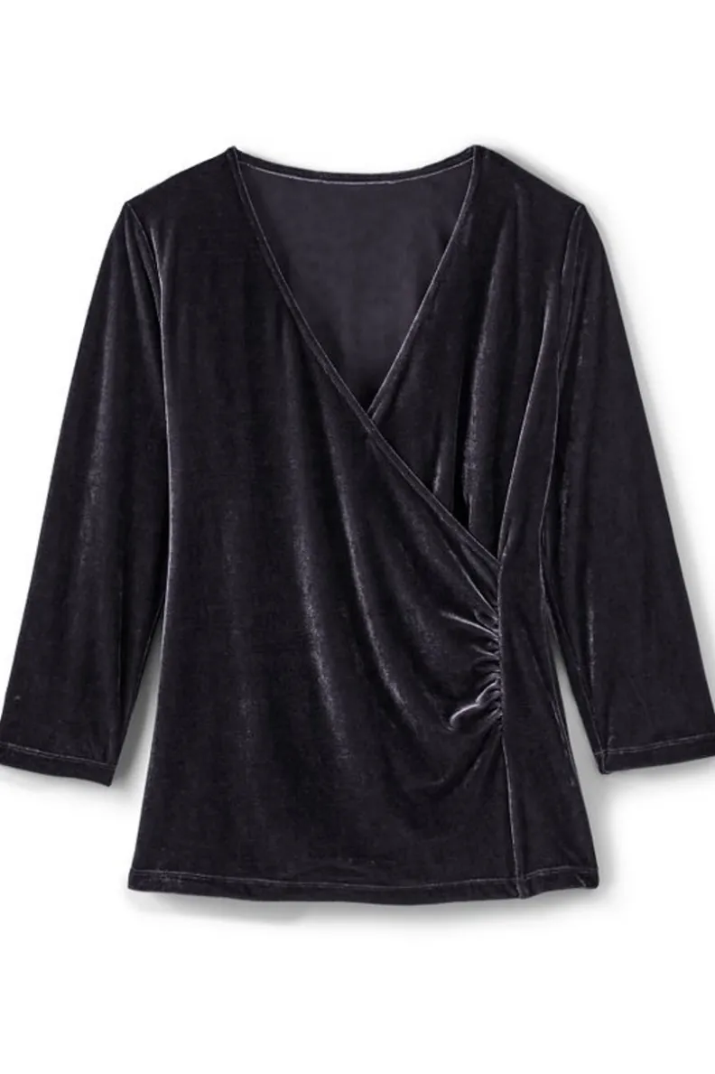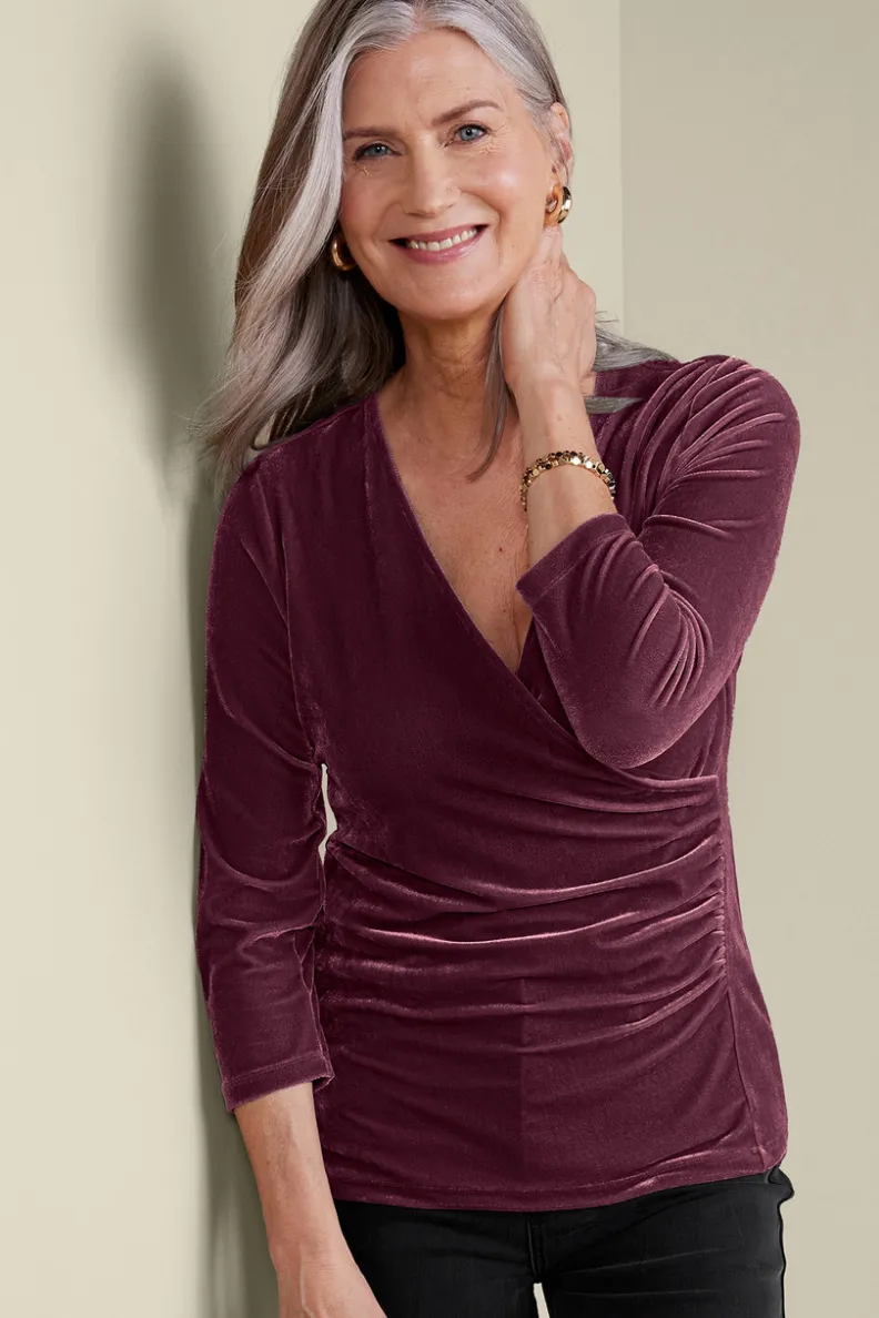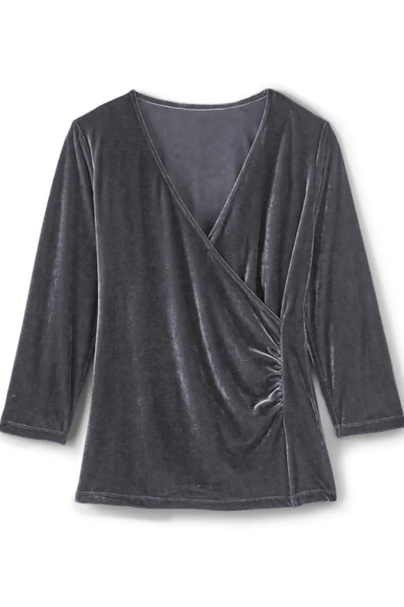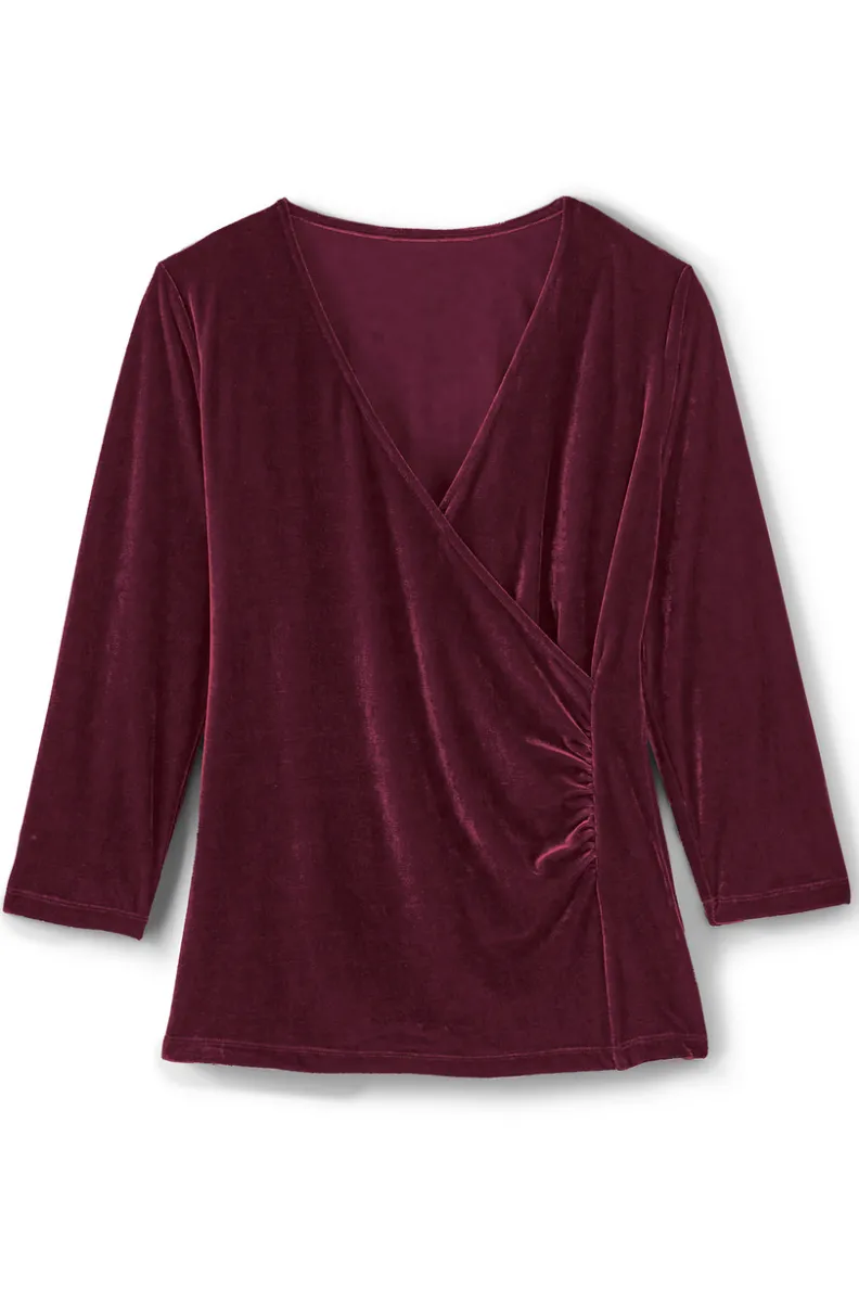 Finished with flattering ruched detail, this touchably soft velvet style is a luxe reimagining of your favorite surplice top. 3/4 sleeves. Front bodice lining.
