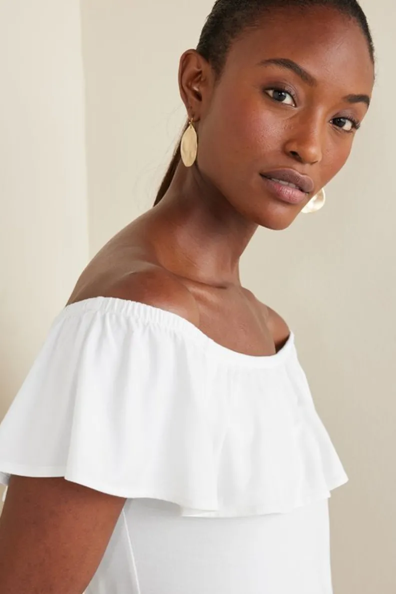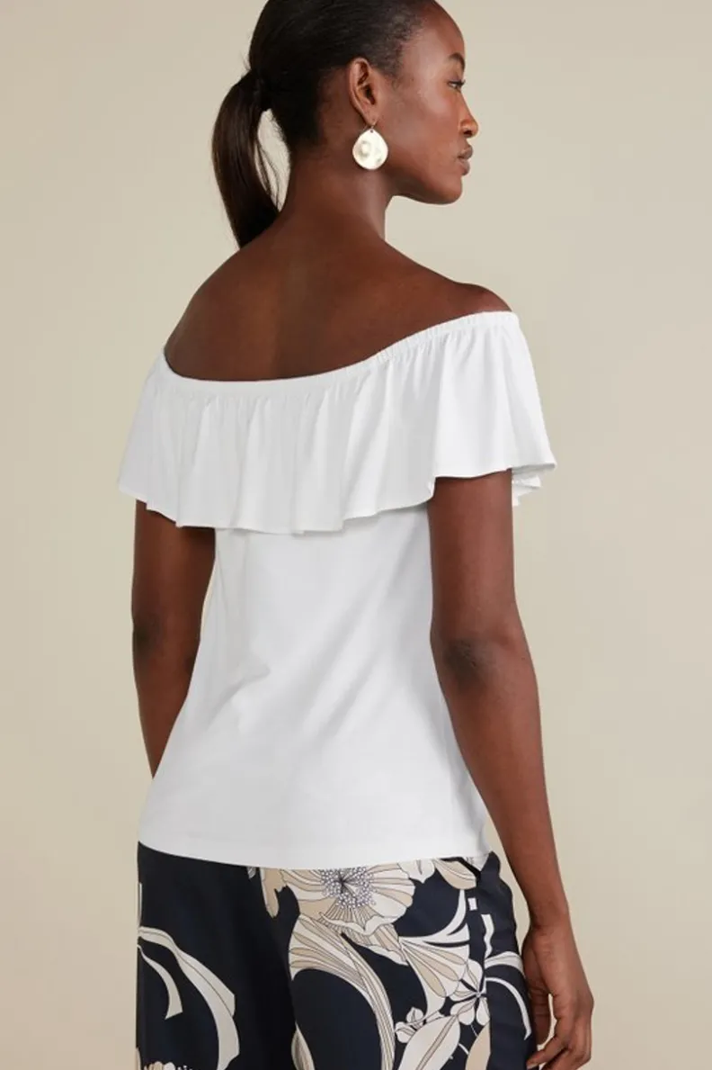 Wear this super-soft knit top your way! Trimmed with a deep ruffle, the elasticized neckline can be styled on or off the shoulder.