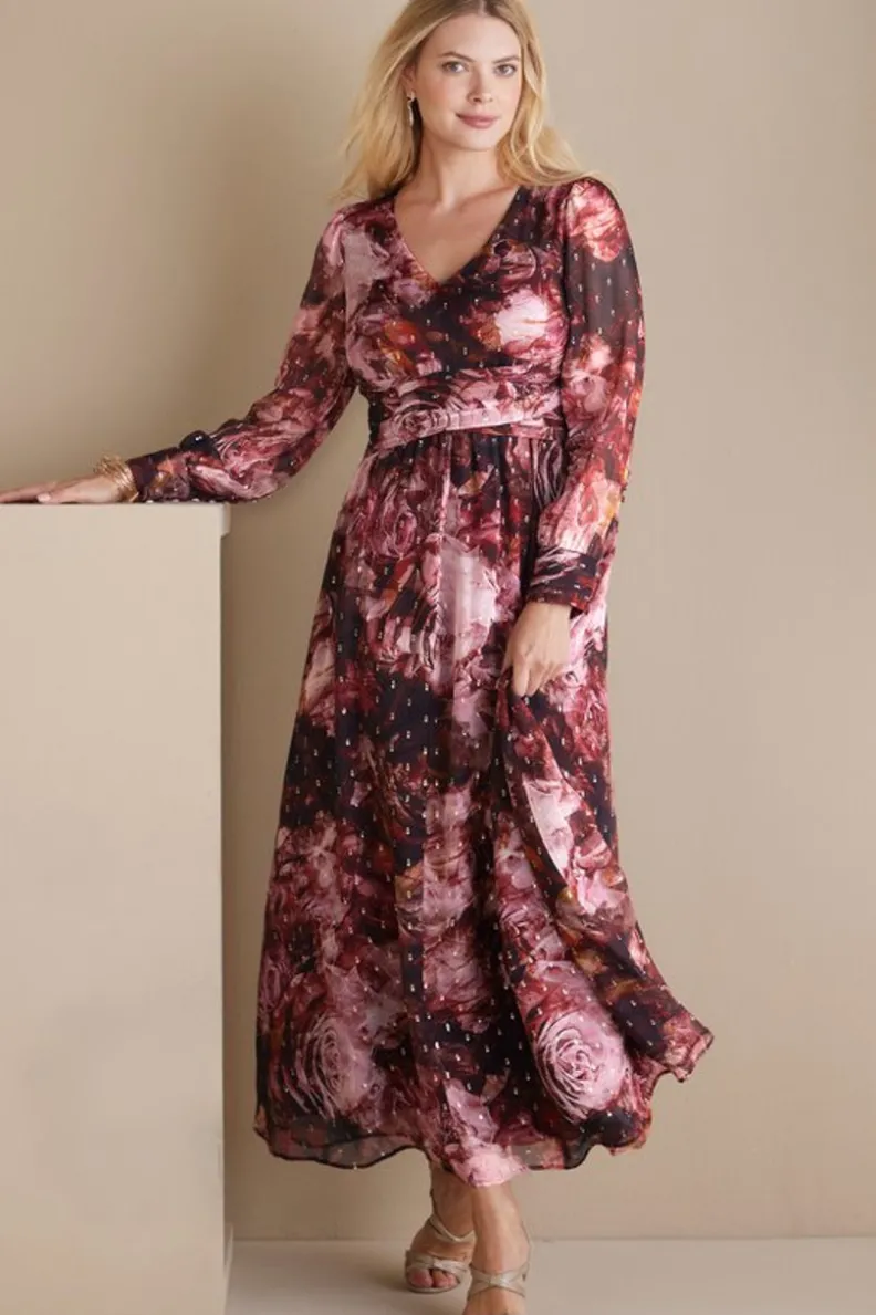 Painterly blooms in shades of rose and cabernet are gilded with shimmering details on this light and flowy silk dress. W…