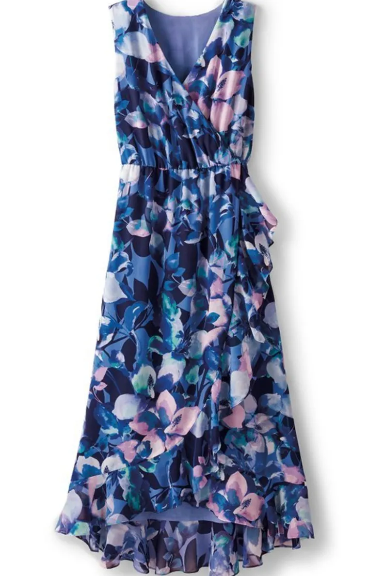 A ruffled, high-low hemline elevates this maxi dress beyond the everyday, making it essential for evenings out and sunny getaways. A surplice neckline, elastic waist, and pullover styling ensure this tank dress feels as effortlessly chic as it looks.