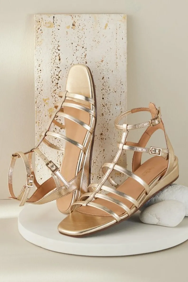 These gladiator sandals will be the MVPs of your sunny season wardrobe. Sleek leather straps wrap your feet for that classic, caged look, while double buckle closures at the ankle ensure a perfect fit. A small 1.25 in wedge heel adds subtle lift, too! Leather.