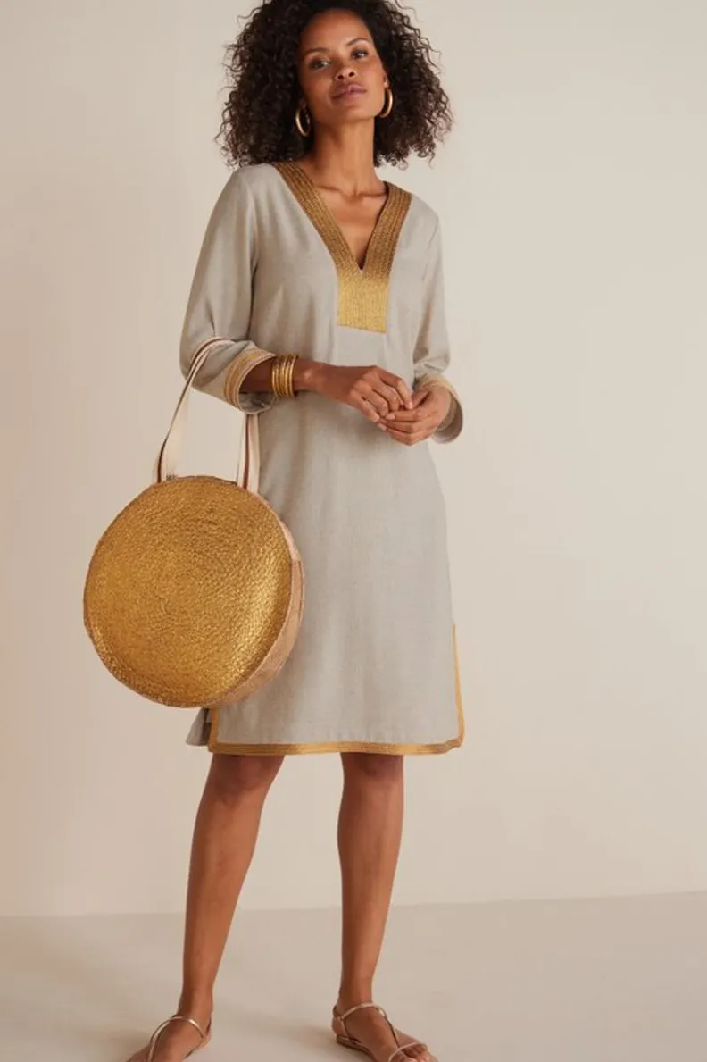 If the eternally-chic Queen of the Nile was hosting a summer soire, we’re certain she’d reach for this beautiful caftan. Gorgeous, golden embroidery details the deep V-neck, 3/4 length sleeves, and side-slit hem for a regal look on the easiest of silhouettes. Perfect for poolside cocktails or dinner dates.