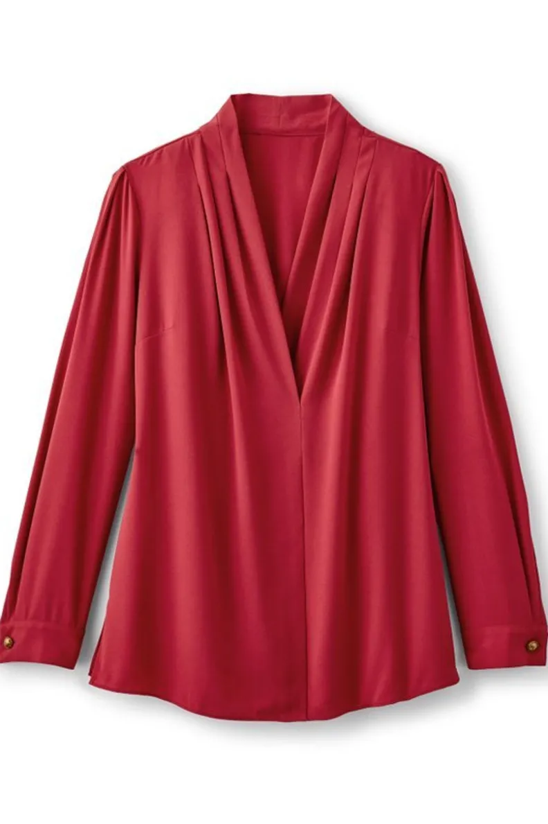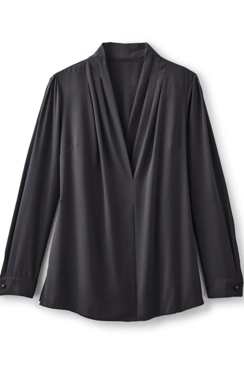 Every closet needs a can’t-miss blouse a refined layer that seamlessly works across your entire wardrobe. Pretty pleating makes the crossover V-neck of this blouse drape so beautifully, while hammered buttons finish the long sleeve cuffs. Side slits.