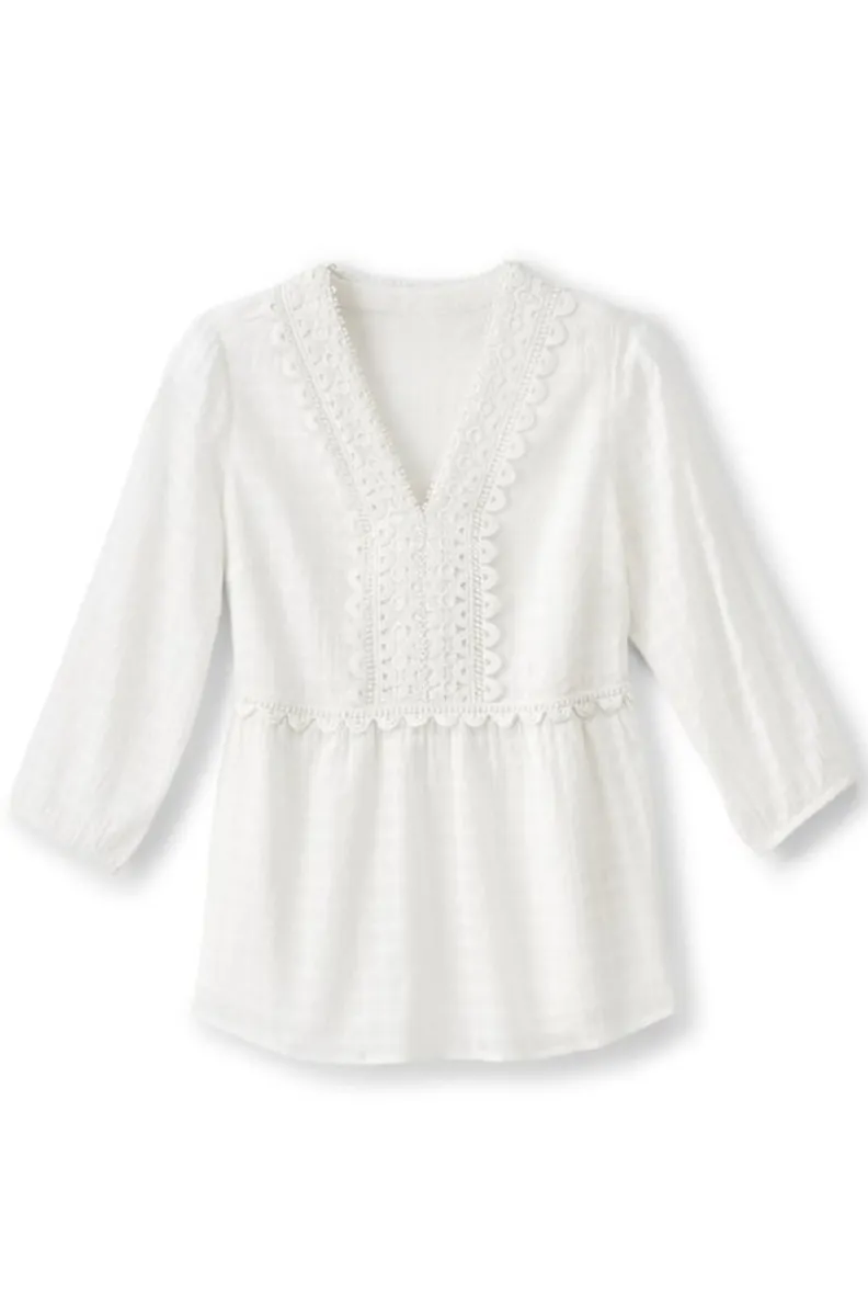 Breezy as can be in lightweight and breathable gauze fabric, this V-neck top is a spring and summer essential. A thoughtfully placed waist seam creates a flattering silhouette, while a lace-trimmed neckline adds feminine detail. Lined.