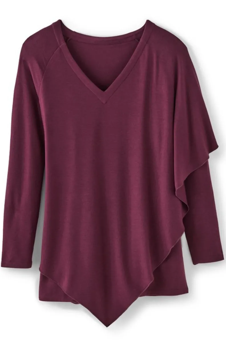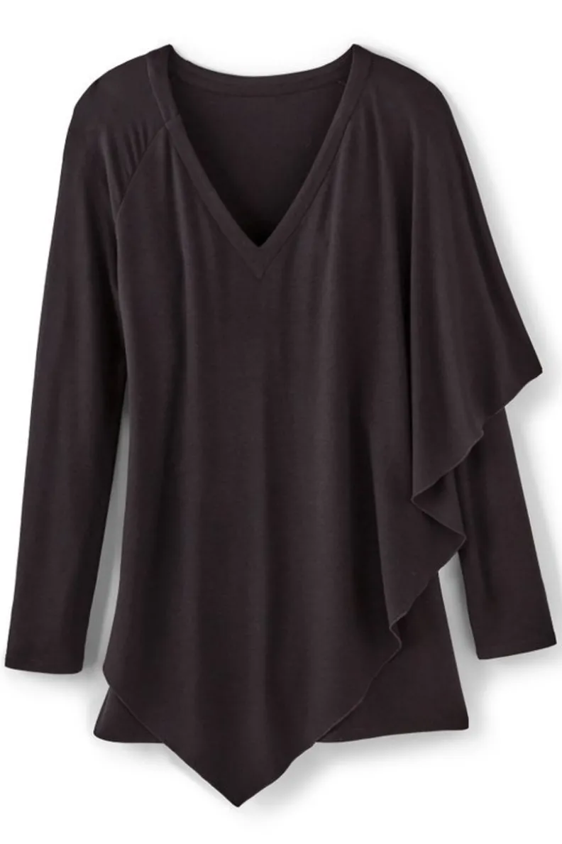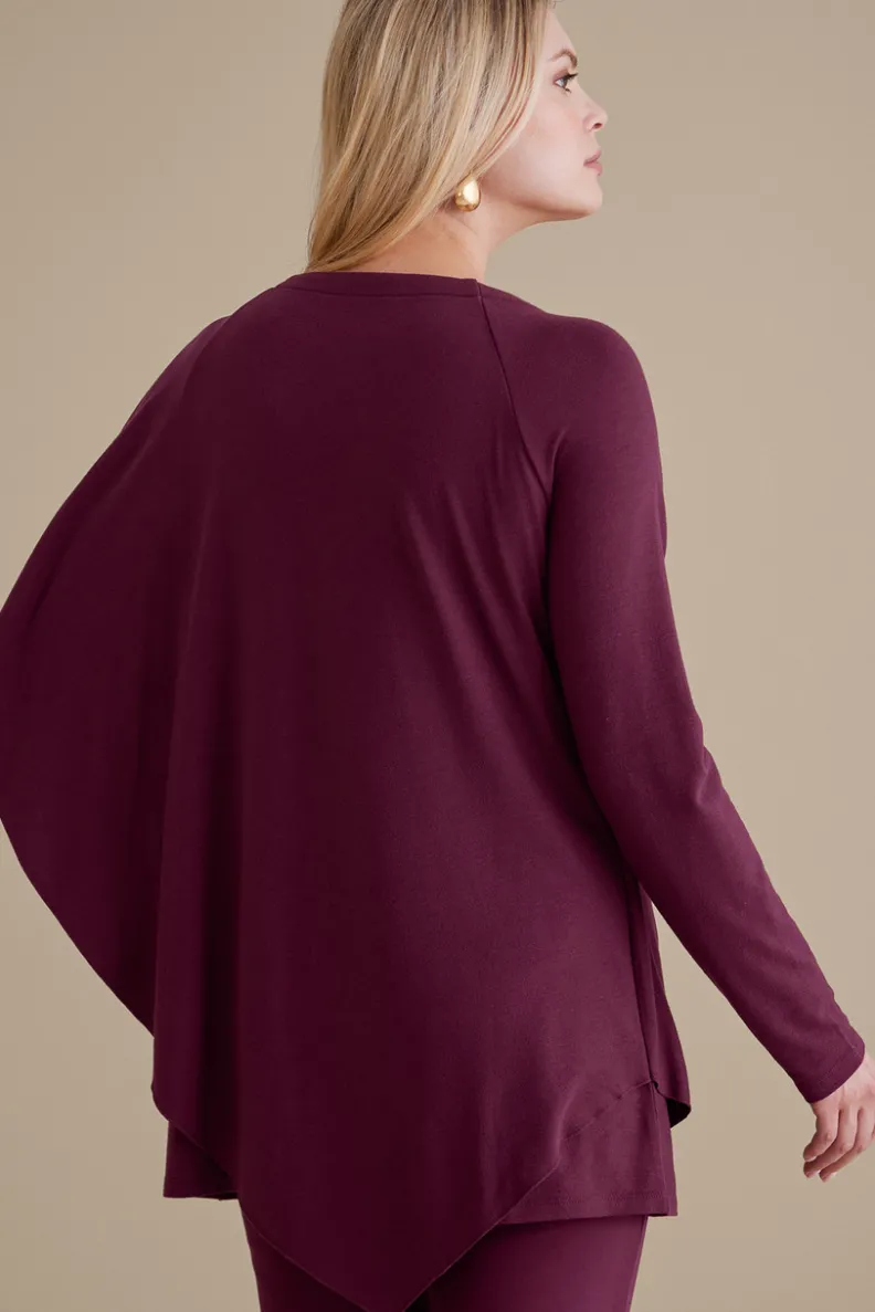 It wouldn’t be fall without our favorite: the Madeline Tunic. This soft, stretch knit top works flattering angles with a novel, cape-like overlay. Elegantly easy, you can dress it up with jewels or wear it casually with jeans.