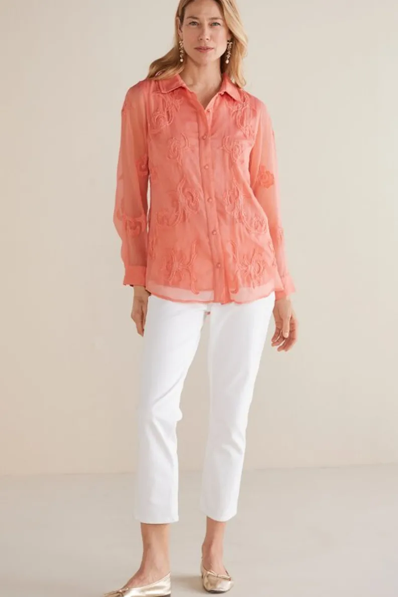 This tunic has layers … literally! The sheer top layer boasts beautiful allover embellishments. Complete with a tonal body lining, shirt collar, button placket and sleeve cuffs, too. Compliments incoming!