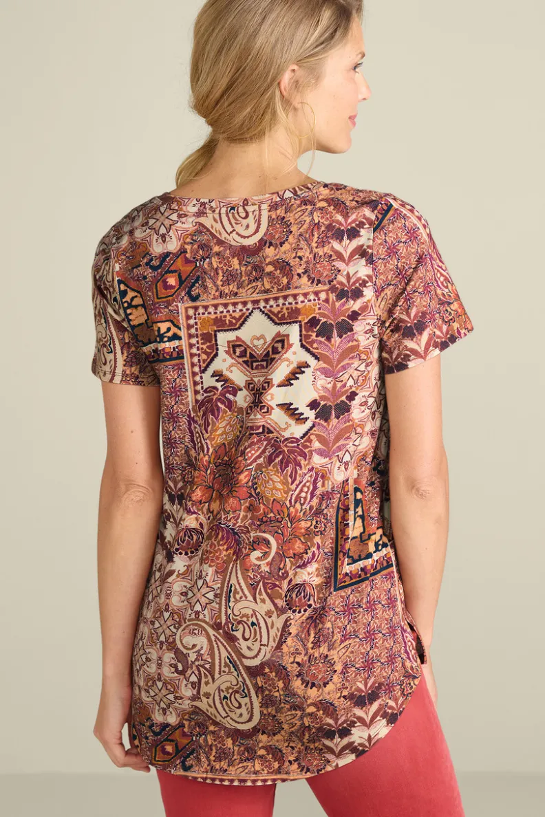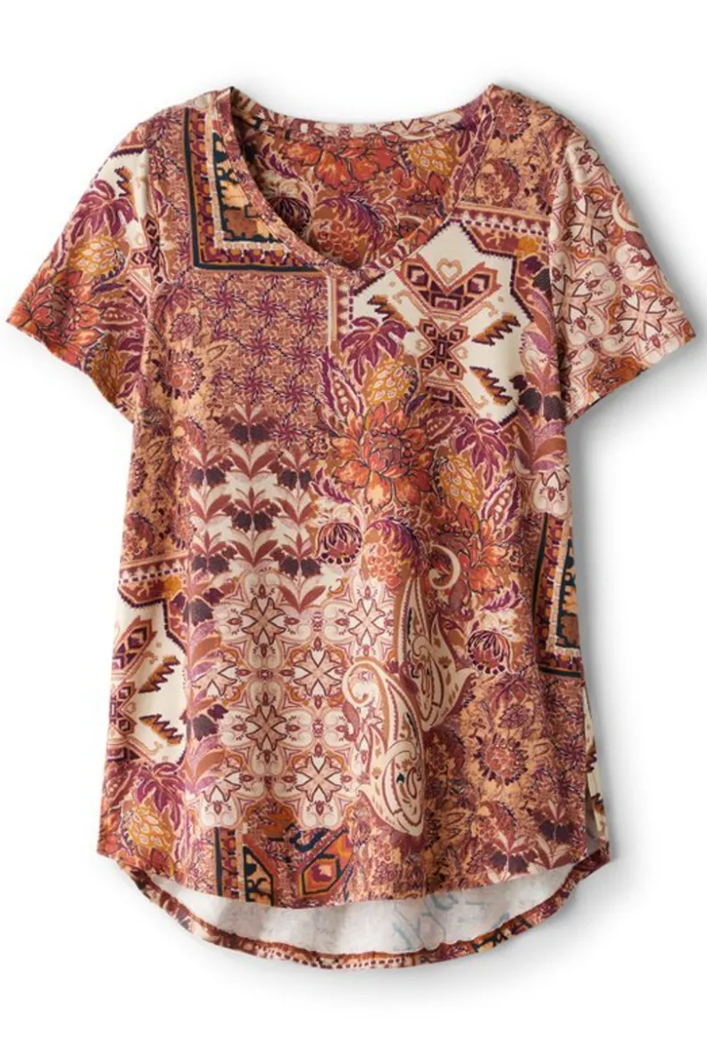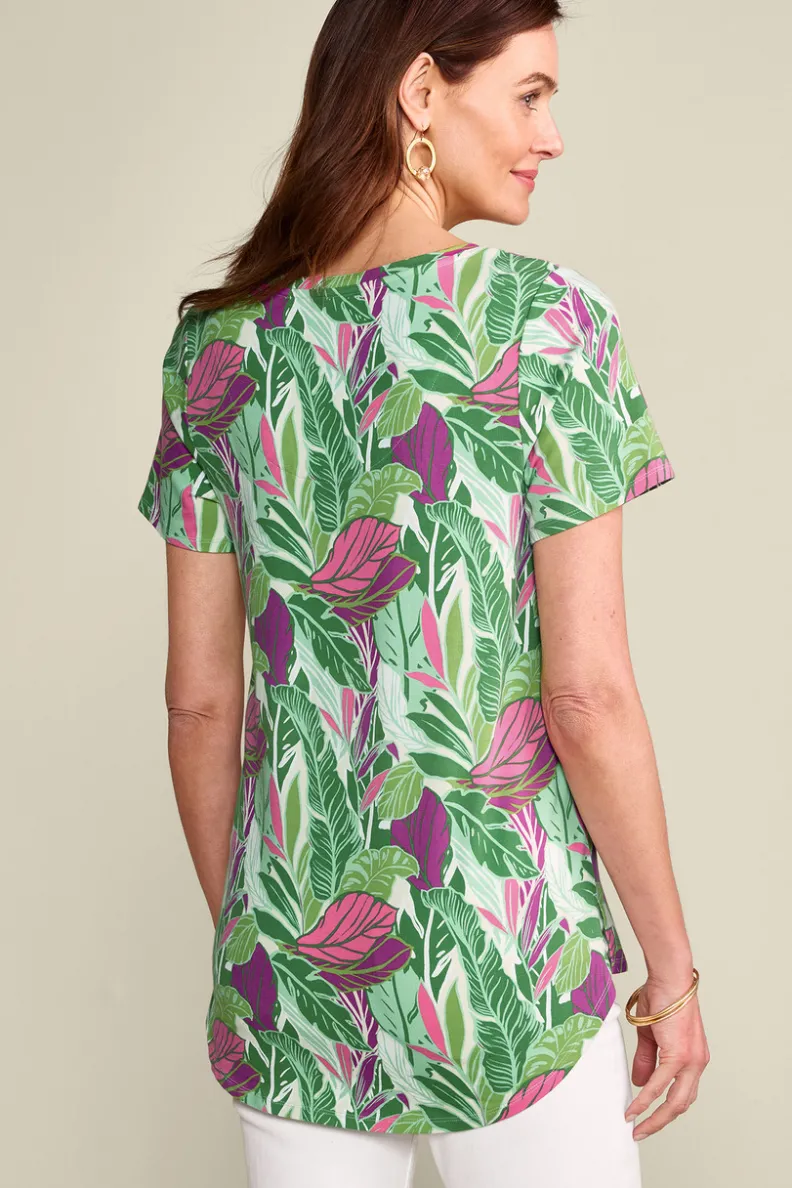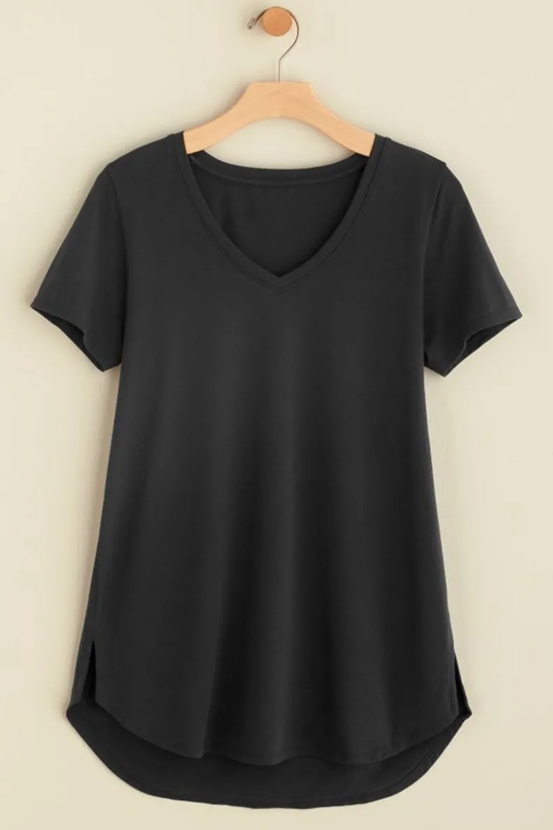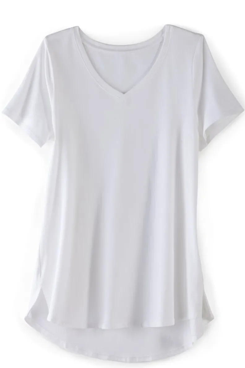 What sets this must-have cotton-blend tee apart are the styling details that make it a favorite for every day. The longer tunic length dips and curves in the back to boost the wearability with leggings, jeans, anything! It’s made from the softest Pima cotton with just the right hint of stretch so the shape always stays fresh. V-neck, short sleeves.