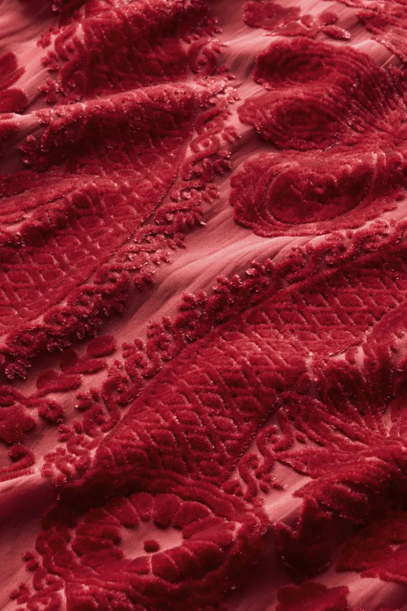 The burnout velvet detail is gorgeous. The hues are to die for. This floral top is altogether feminine and chic, simply magical for the holidays and beyond. Deep statement cuffs on the sheer, billowy sleeves are fastened with covered buttons. Lined body, keyhole back closure.