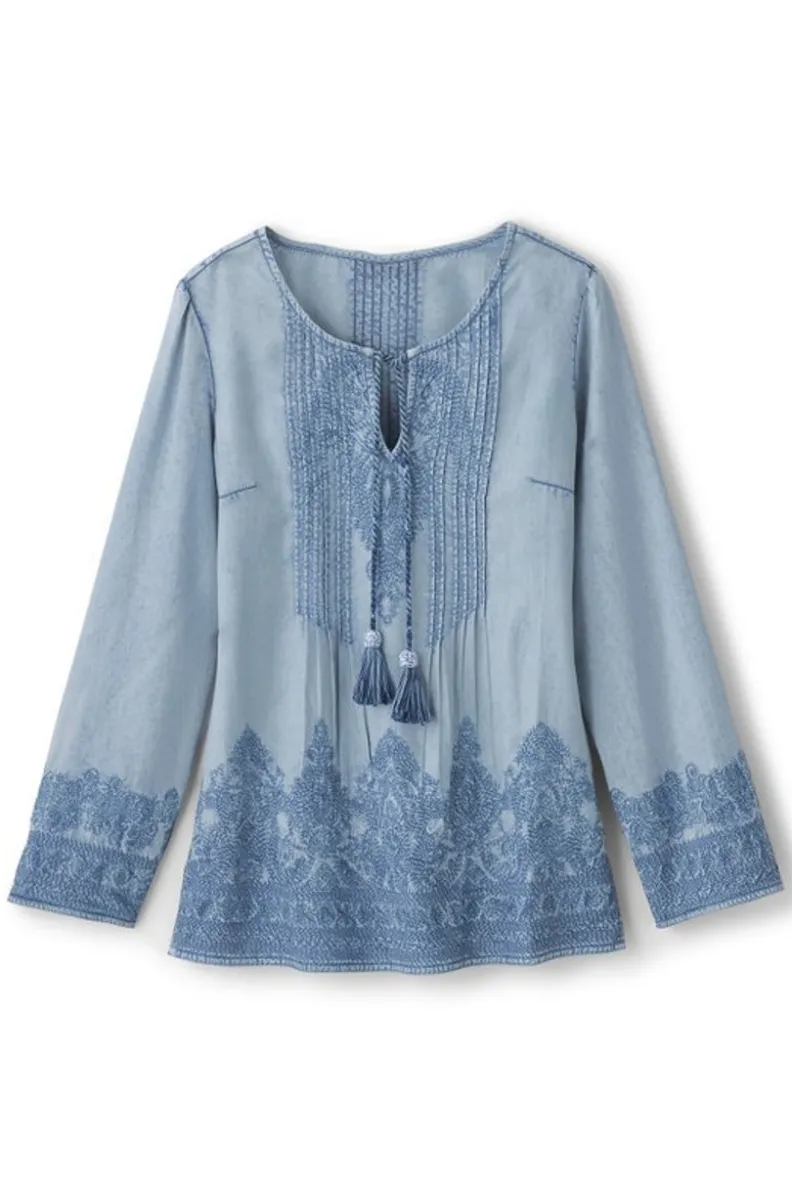 Sale Soft Surroundings Emily Embroidered Tencel™ Top LightChambray