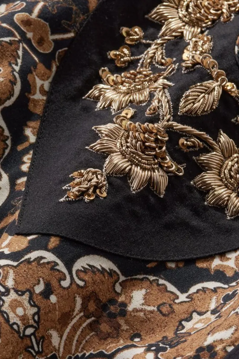 Cue the contrast solids and prints, wovens and knits. An easy knit dress with printed woven panels, plus metallic embroidery and embellishments. The scoop neck with front button-closure keyhole is charming, while the back hook-and-eye closure zipper is convenient. Long sleeves for endless versatility.