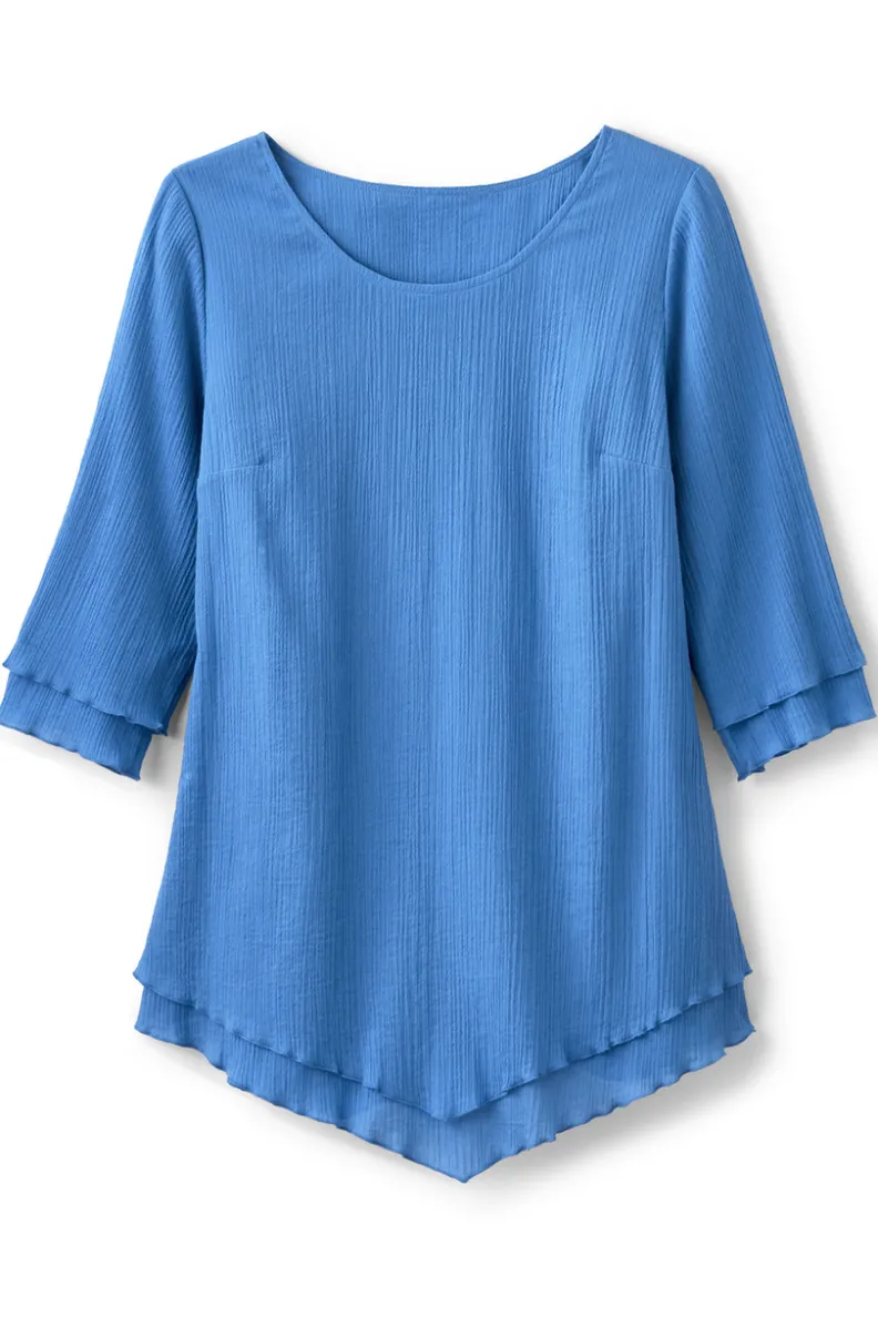 A beloved Soft favorite, in a new range of hues. Double layers of cotton come together to create one fantastic top with a chic lettuce edge on the 3/4 sleeves and pointed bottom hem. Scoop neck.